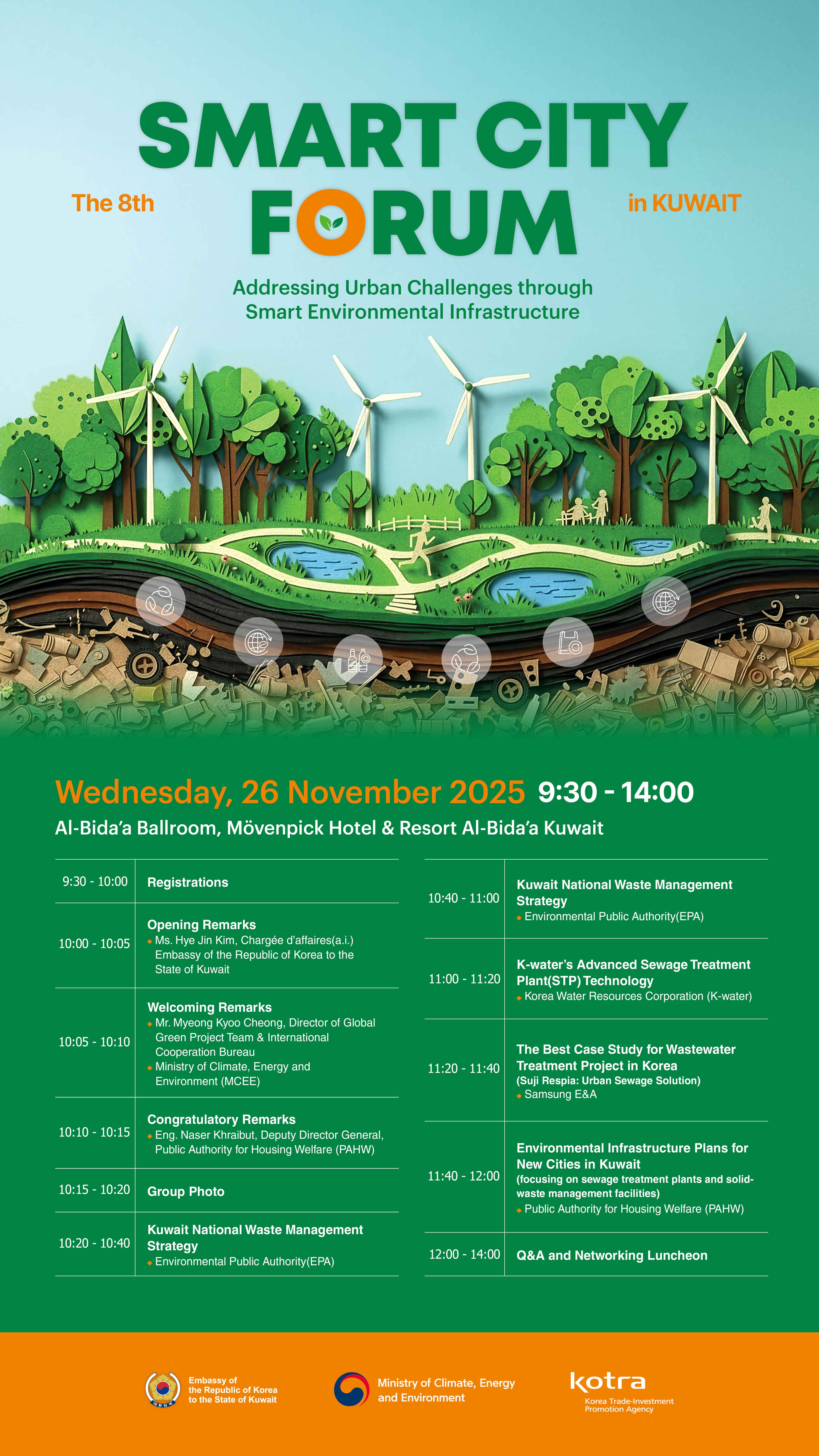 - 높아지는 스마트시티 건설 수요에 대응하는 쿠웨이트 올해로 8번째 개최되는 한-쿠웨이트 스마트시티 포럼은 주쿠웨이트대한민국대사관에서 주최하는 행사로, 한국과 쿠웨이트 양국 간 스마트시티 건설 협력을 도모하고자 추진된다. 2017년 이후 코로나19로 인해 오프라인 행사 진행이 불가능했던 2020년을 제외하고, 매년 정기적으로 추진되었다. 올해는 주쿠웨이트 대한민국대사관과 KOTRA 쿠웨이트무역관이 한국 기후에너지환경부, 한국환경산업협회와 함께 포럼과 연계해 우리 녹색산업 분야 기업과 쿠웨이트 현지 파트너 매칭을 위한 '녹색산업 시장개척 수출상담회'를 개최했다.